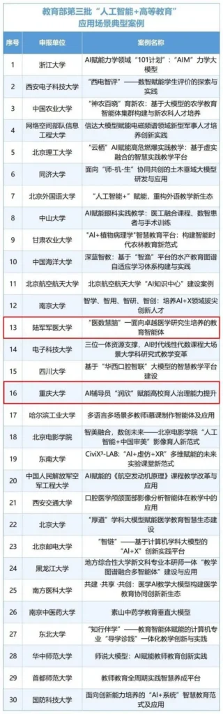 近日,教育部公布第三批“人工智能+高等教育”典型应用场景案例名单,全国共30项案例入选,重庆市入选案例2项——重庆大学《AI辅导员“润欣”赋能高校育人治理能力提升》、陆军军医大学《“医数慧脑”一面向卓越医学研究生培养的教育智能体》,展现了重庆在人工智能赋能高等教育领域的创新实践。