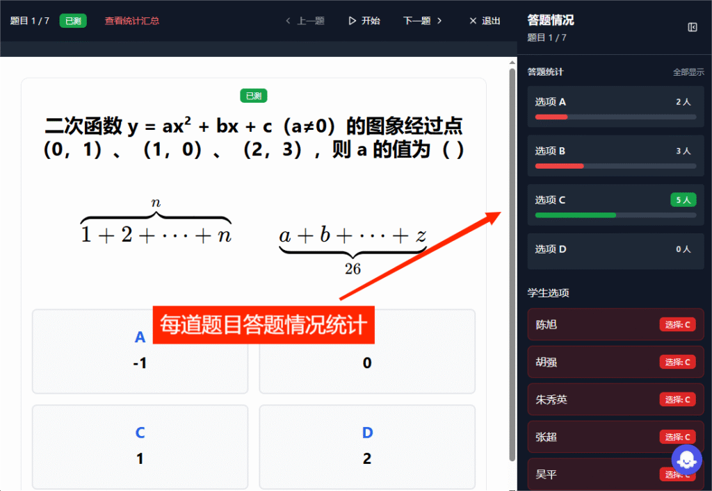 2、📈 图 3 是小测里每道题的选项选答比例,还有每个学生的选择~ 点一点选项,就能直接看到选这个选项的学生啦