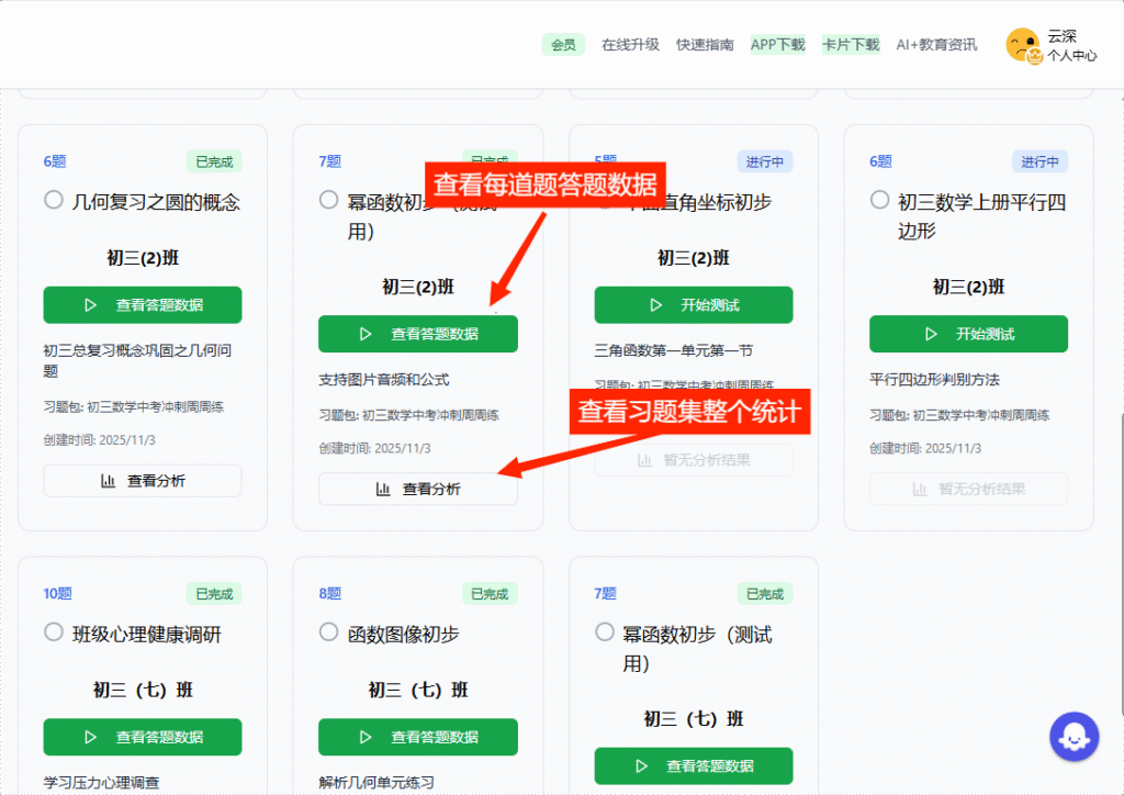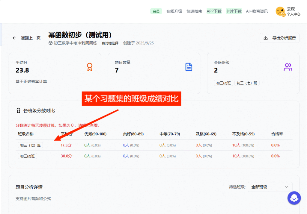3、🏫 图 4 是小测成绩数据!一个习题集能给多个班级测试,这里直接就能轻松查看班级对比