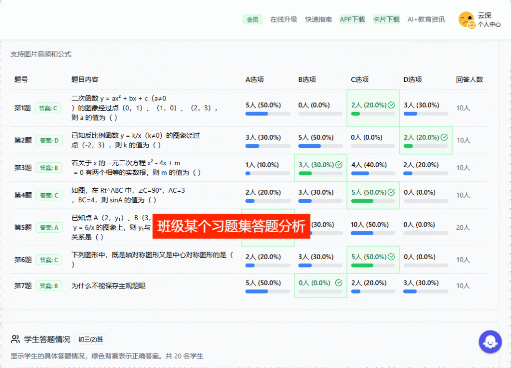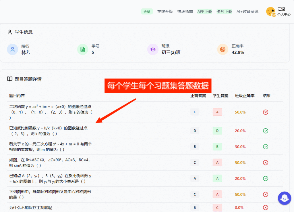 9、🆚 图 10 能精准查看某个学生某次小测的答题情况,还能直接和班级正确率做对比~ 相信有了题目、小测、习题包、班级、学生这些不同维度的详细数据,老师一定能更懂学生的真实学情,教学也能更有针对性呀💪