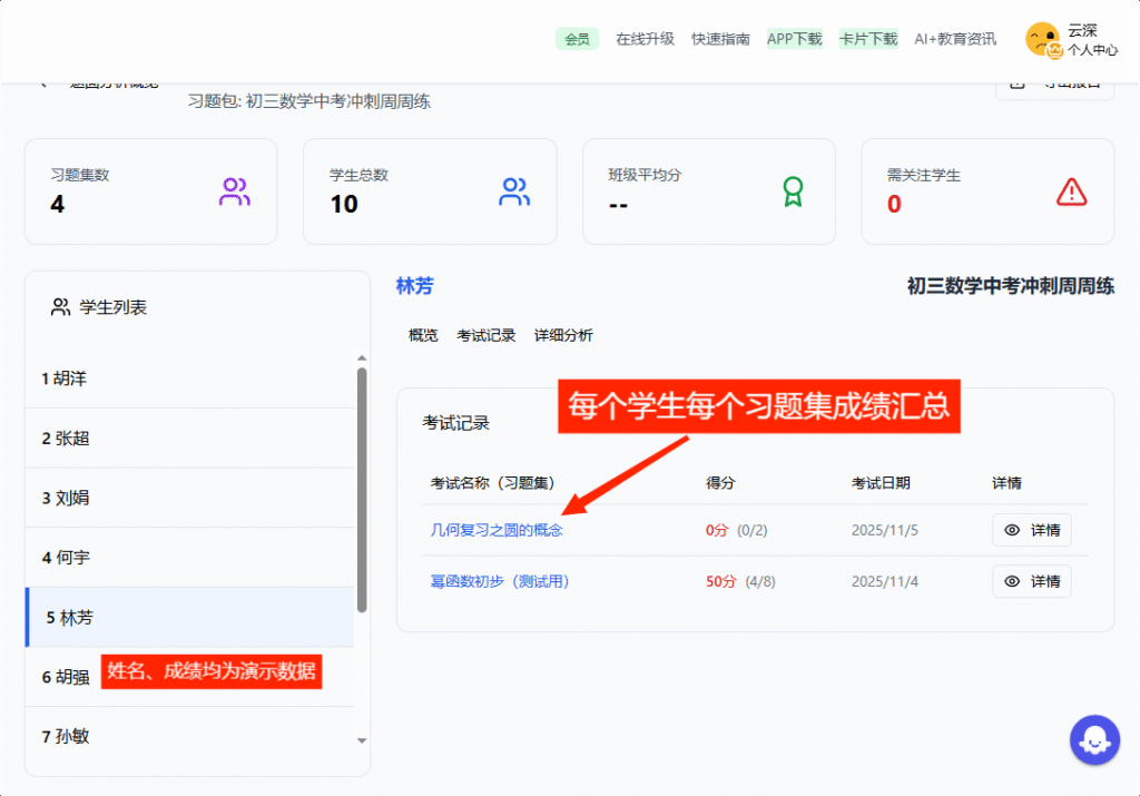 8、🎯 图 9 是学生维度的专属成绩!能具体看到某个学生在某个习题包里,每一次小测的分数