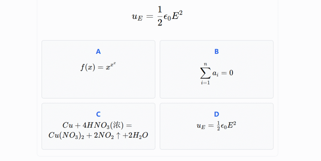 – 播放界面对公式显示进行了优化:如果你是年度或长期会员,题干和选项里的数学公式(LaTeX)将直接渲染成漂亮的格式,阅读更舒服;普通和月度用户仍然能看到题目与媒体内容。
