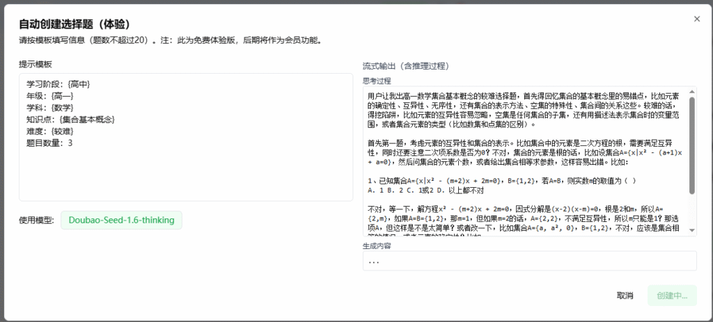 – 现在用 AI 帮你创建题目时,生成过程会实时呈现在右侧面板,你可以边看边取消或等待完成。