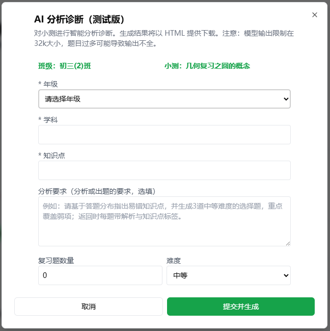 – 老师可以在标准模板基础上,加入自己的提示词,让生成的诊断分析报告更符合老师要求。